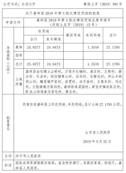 批復(fù)意見(jiàn):同意征收嘉祥縣上列農(nóng)用地、未利用地,總計(jì)土地 27.1795 公頃。