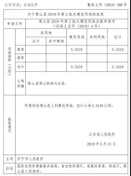 批復(fù)意見(jiàn):同意征收梁山縣上列建設(shè)用地,總計(jì)土地 5.3418 公頃。